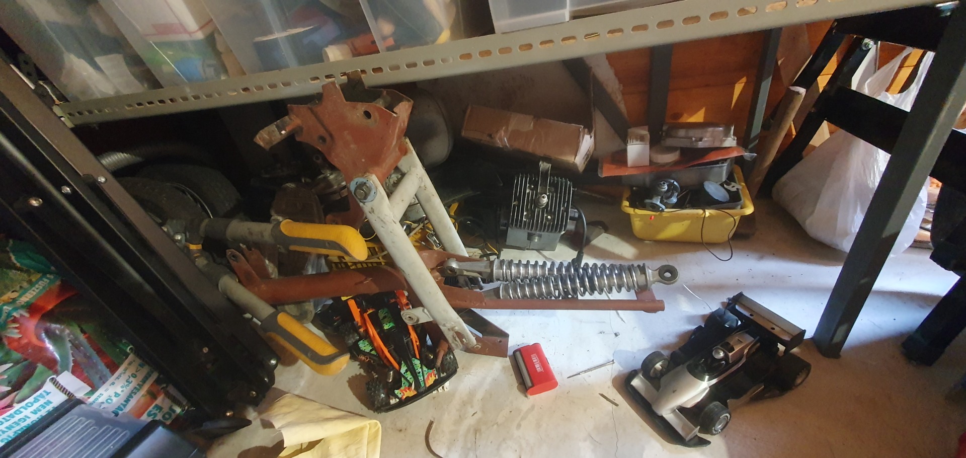 A váznál is voltak bajok mikor már a motort is beleraktuk megláttam egy repedést a motortarton felül, de igazából nem az tartotta legfőbb. Amit viszont illik tudni az hogy ez nem egy gyári váz hanem egy tákolmány. Na és haladunk tovább a dolgokkal elérkezünk az első lengéscsillapitóhoz amit már apa egyszer bele rakott. Később rá jöttünk hogy már úgy hoztuk haza hogy az első lengéscsillapitók úgyanazok vagyis mindkettő bal oldalra illene. Ami nem volt könnyű kerékkel összerakni meg magát a lengéscsillapitót is belerakni. Meg kiderült hogy van mégegy lengéscsillapitónk előre ami egy Romet Kadetté volt. Megpróbáltuk mi belerakni a kadettét mert az legalább nem ugyanaz (nem néz balra vagy jobbra mindkettő) bele belement és jó is volt csak magas. Aztán ugyebár van a fleksz meg a lengéscsillapitó ami egyenlő = a lengéscsillapitórúd kisebbitése ami nem működött úgyhogy jobban ne is mennyünk bele. Na és aztán nagy küzködéssel bent volt a lengéscsillapitó.